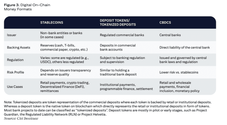Citi is positive on the growth outlook for stablecoins, but believes they will co-exist with other on-chain money formats, especially bank tokens (tokenized deposits, deposit tokens, and hybrids). The bank predicted that the turnover of bank tokens could exceed stablecoins by 2030, even with a small shift of current traditional rails onchain.