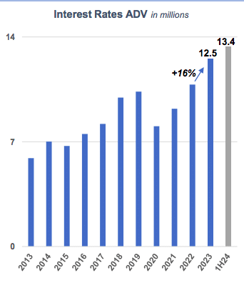 Lynne Fitzpatrick, chief financial officer of CME Group, said on the call that more than half, 52%, of the exchange’s trading days were above 25 million contracts in the first half of this year, compared to 34% in the first half of 2023.