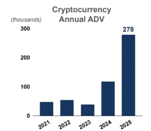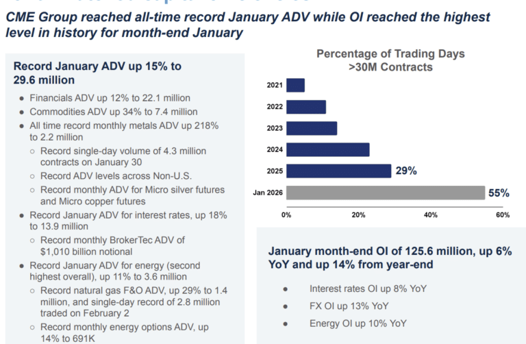 CME said a risk-always-on environment in 2025 resulted in the fifth consecutive year of record volume. Average daily volume increased 6% year-on-year to 28.1 million contracts. The growth was broad-based and included records in the interest rate, energy, metals, agricultural and crypto complexes, according to Duffy.