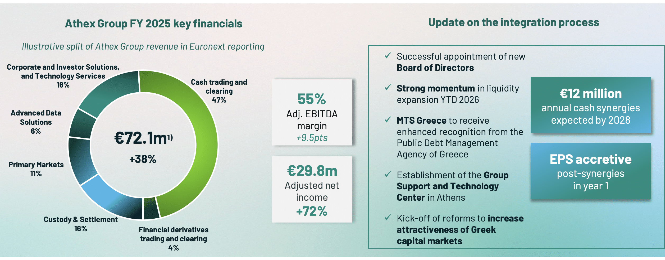 Athex’s new board of directors was appointed in January 2026, but integration has not truly started. Euronext expects to deliver €12m of annual cash synergies by the end of 2028 through migrating Greek trading to Optiq, the group’s proprietary trading platform, the harmonization of central functions and the expansion of top line initiatives. Implementation costs will be €25m and the deal is expected to be accretive for Euronext shareholders within the first year after synergies are realised.