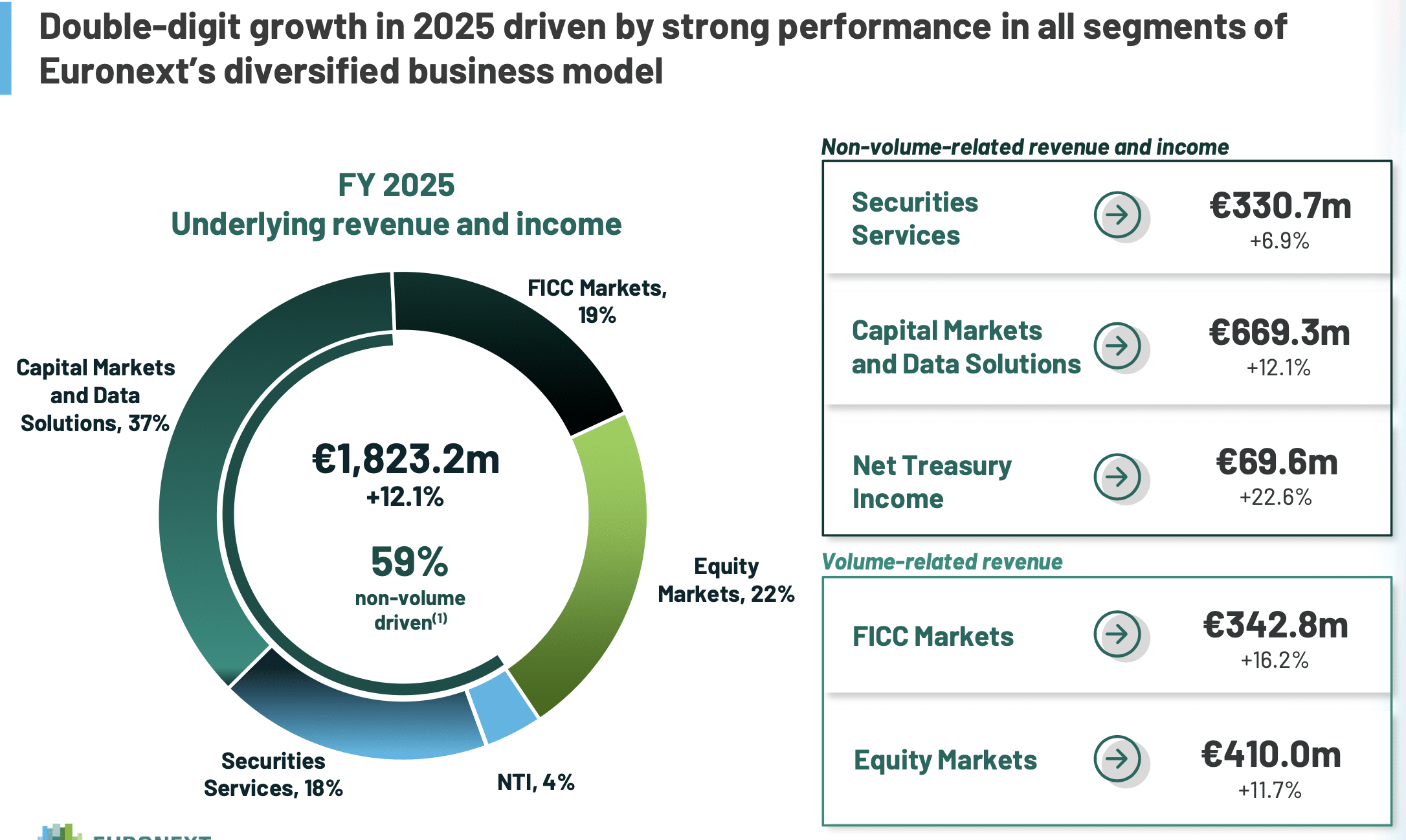 Non-volume-related revenue and income represented the majority, 59%, of total revenue and income, a 10.9% increase compared to 2024. Boujnah said this was driven by growth in custody and settlement.