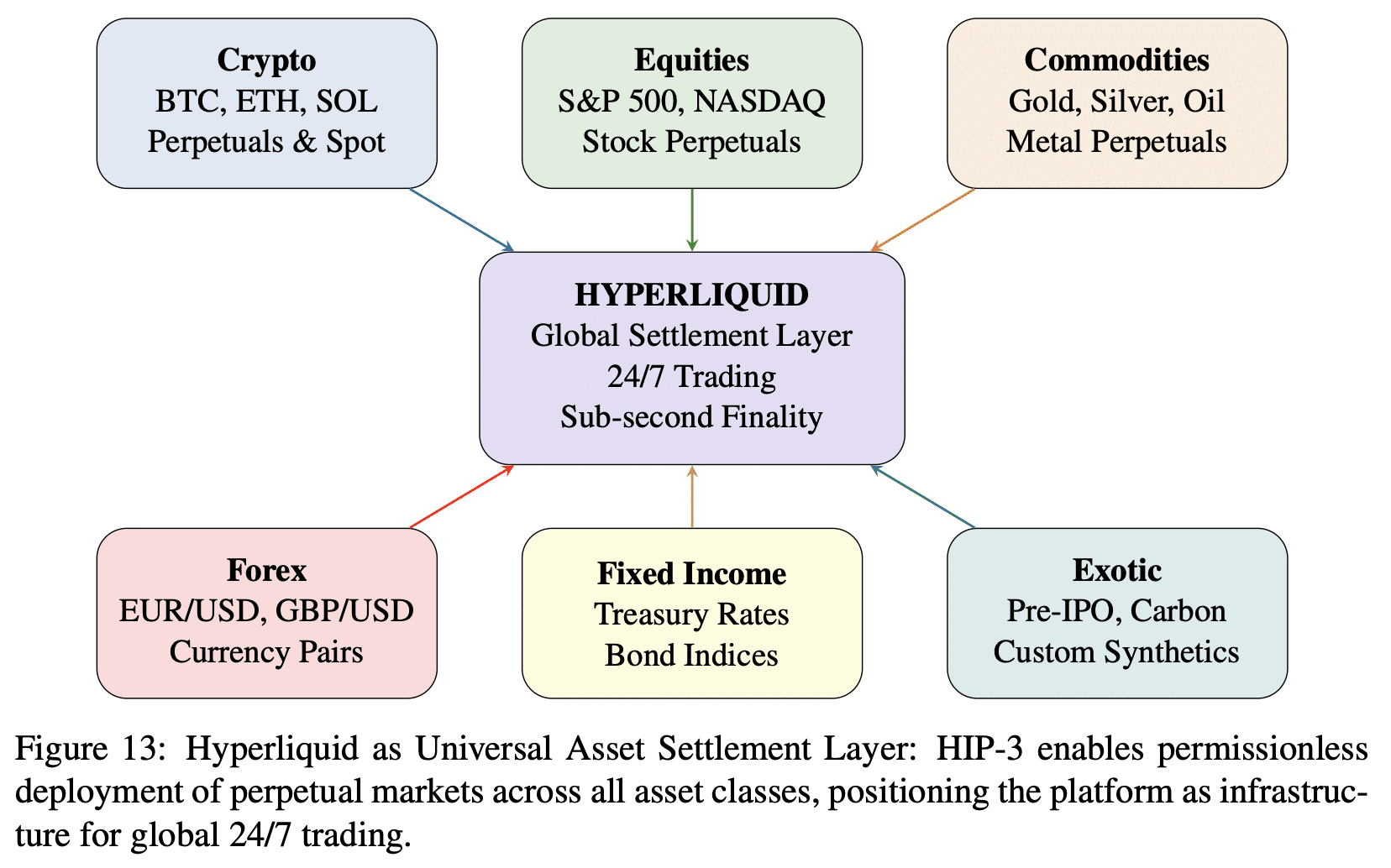 For example, Hyperliquid has a fully onchain central limit order book (CLOB) with sub-second finality and institutional-grade throughput exceeding 200,000 orders per second, with architectural capacity to scale beyond 1 million orders per second. A central limit order book is the same price discovery mechanism used by traditional exchanges such as NYSE and Nasdaq, through matching bid and ask orders. Every fill, liquidation, and funding rate payment is verifiable on Hyperliquid’s public ledger and the protocol implements a cross-margining system that allows traders to increase capital efficiency, according to the report.