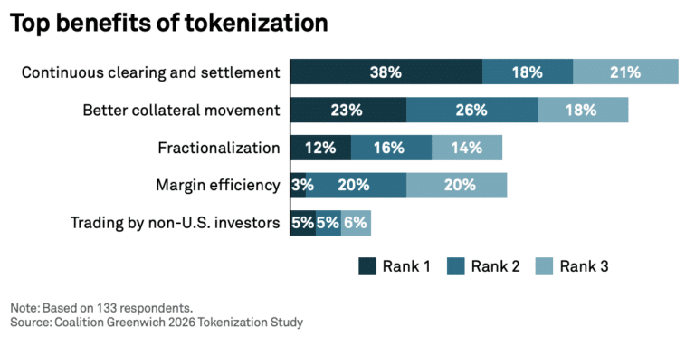 Market participants view the most powerful innovations of tokenization in post-trade operations. More than half, 55%, of respondents said continuous clearing and settlement was the biggest benefit of tokenization due to the increase in capital efficiency, according to a survey from consultancy Crisil Coalition Greenwich.