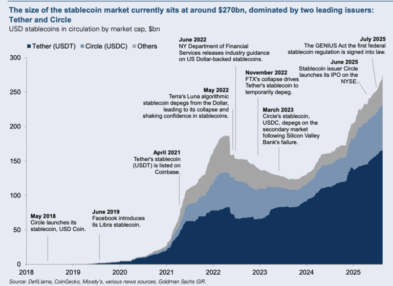 Goldman Sachs said in a report that it has been the “summer of stablecoins.” The bank said that in addition to the passage of the GENIUS Act, major companies are exploring launching their own stablecoins and Circle, issuer of the USDC stablecoin, went public in June this year.