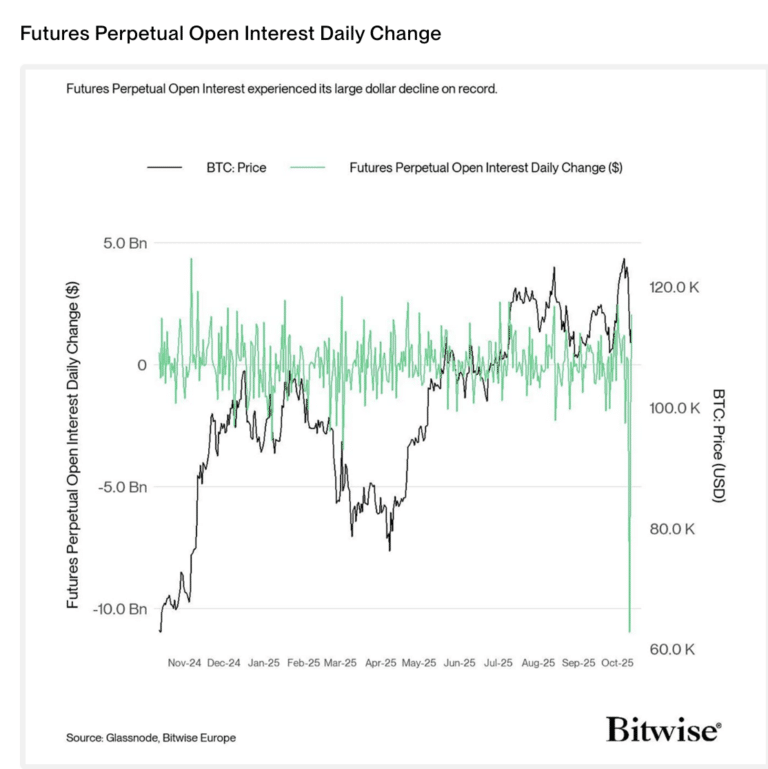 The drop was intensified by an unprecedented wave of long futures liquidations, with perpetual futures open interest plunging by nearly $11bn, the largest decline on record, according to Bitwise Europe. Perpetual futures do not have an expiry date, which allows investors to speculate, with leverage, on the price of a cryptoasset without having to own the underlying.