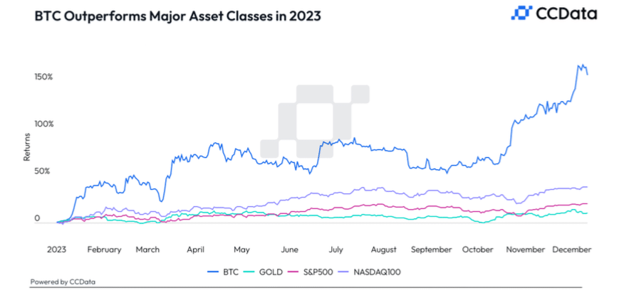 Bitcoin rose 156% in 2023 which CCData said was more than traditional financial benchmarks such as Nasdaq, S&P500, and Gold, and will remain a catalyst this year. The approval of BlackRock’s ETF could propel Bitcoin’s price to “new, extraordinary heights” according to CCData.