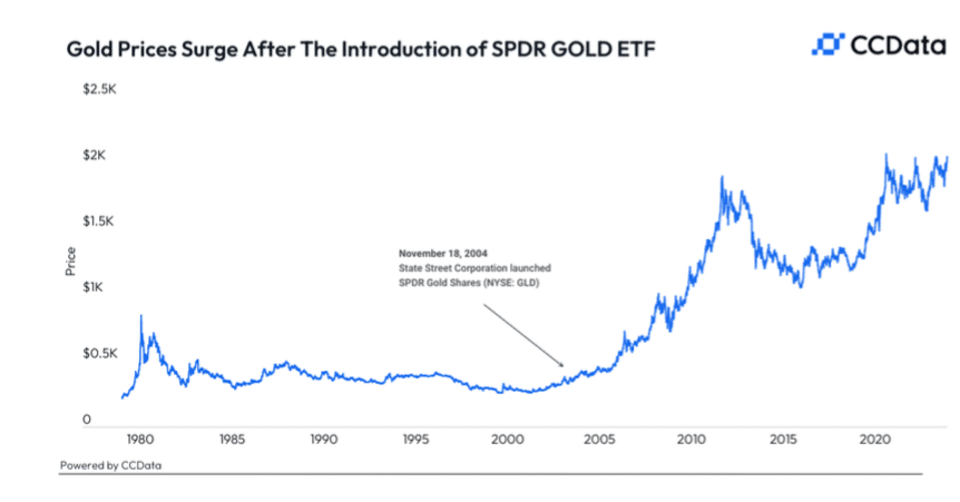 CCData highlighted the performance of gold following the launch of the first SPDR ETF and said bitcoin may be entering a new period of accessibility and adoption.