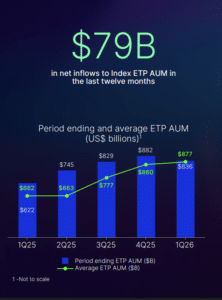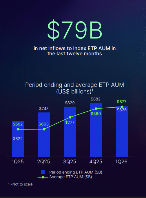 Average index exchange-traded product (ETP) assets under management reached a record $877bn in the first quarter. ETP assets at the end of the first quarter was $836bn.