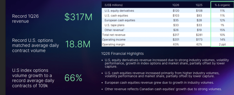 Nasdaq Market Services generated record net revenues in the first quarter which the group said was driven by record volumes in U.S. equities, U.S. options and elevated volumes in the European market.Index options revenue more than doubled year-over-year.