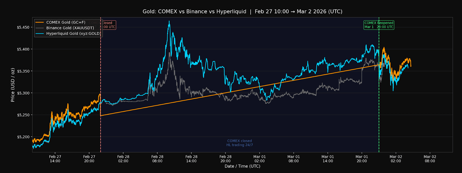 When Comex reopened on Monday 2 March, gold and silver prices on Hyperliquid were closer to Comex by 22 basis points and 31 basis points despite Binance having more volume, according to OxResearch.